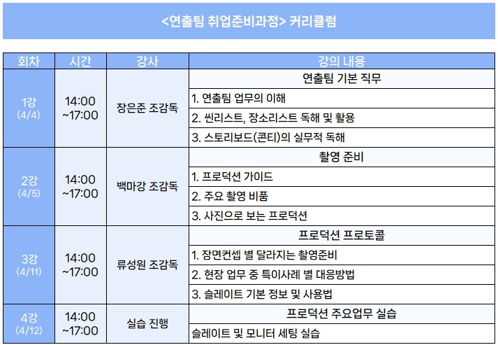 - <연출팀 취업 가이드> 수강자는 본 강의의 얼리버드 할인(400,000원)과 동일한 할인이 적용됩니다.